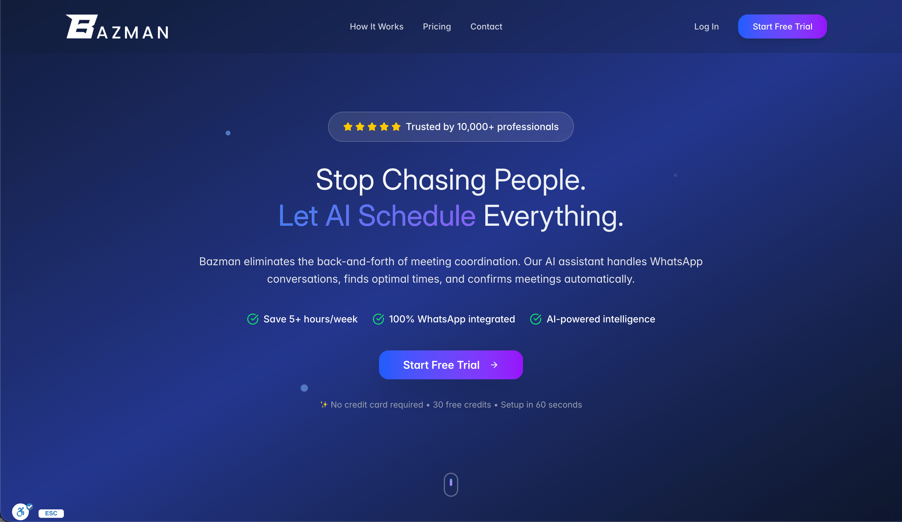 Bazman היא פלטפורמת תיאום פגישות חכמה שמבטלת לחלוטין את ההתשה שבפינג פונג הבלתי נגמר של קביעת פגישות. המערכת פועלת בעיקר דרך WhatsApp, כאשר העוזר מבוסס ה-AI של Bazman פונה למשתתפים, מתאם מולם את הזמן האופטימלי, ומשלים את קביעת הפגישה, בלי שתצטרכו לשלוח אפילו מייל אחד.