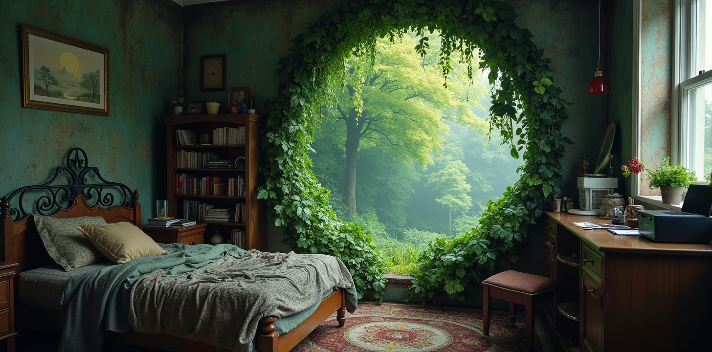 a portal into a mythical forest on the wall of my small messy bedroom