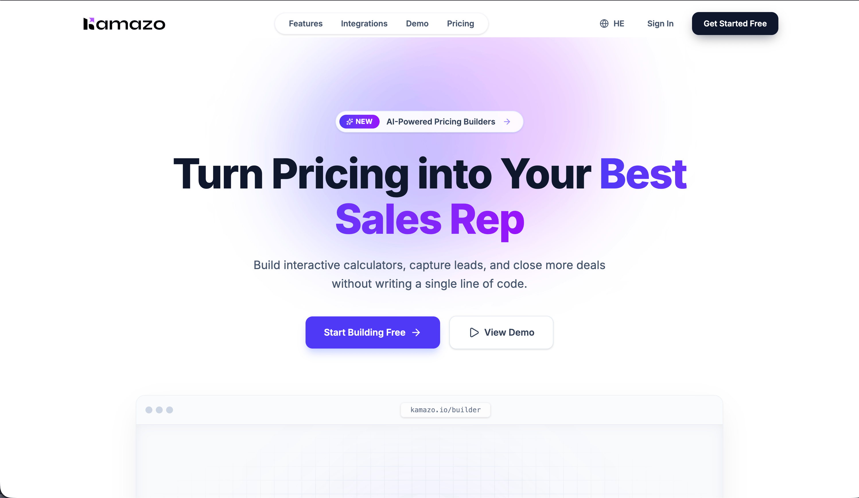 Kamazo הוא בונה AI ללא קוד, שמאפשר לעסקים ליצור מחשבוני תמחור אינטראקטיביים. במקום טבלאות מחירים סטטיות ומבלבלות, או מחסומי "צור קשר עם המכירות" שמייצרים חיכוך גבוה, Kamazo מאפשר ללקוחות פוטנציאליים להפיק הצעת מחיר מותאמת ומיידית בעצמם, תוך איסוף פרטי לידים איכותיים ובעלי כוונת רכישה גבוהה עבור צוות המכירות שלכם.