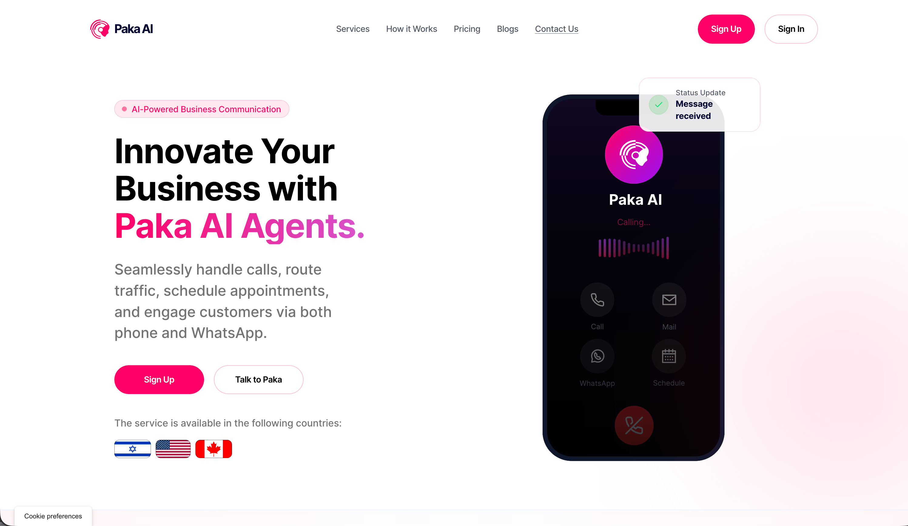 Paka AI מספקת חבילה עוצמתית של סוכני AI שיחתיים, המשמשים כעמדת הקבלה שלכם 24/7. המערכת נועדה לבצע אוטומציה ולשדרג את התקשורת העסקית, ומאפשרת ל-Paka לטפל בצורה חלקה בשיחות נכנסות, לנתב פניות בצורה חכמה, לקבוע פגישות ולתקשר עם לקוחות גם דרך מערכות טלפוניה וגם דרך WhatsApp.